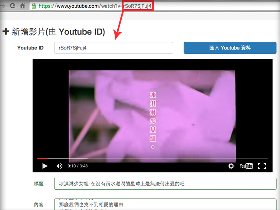 透過 YouTube ID 的方式設定,系統自動會將 YouTube 上的影片位置、影片標題、內容說明、標籤 & 影片海報圖標匯入到此平台